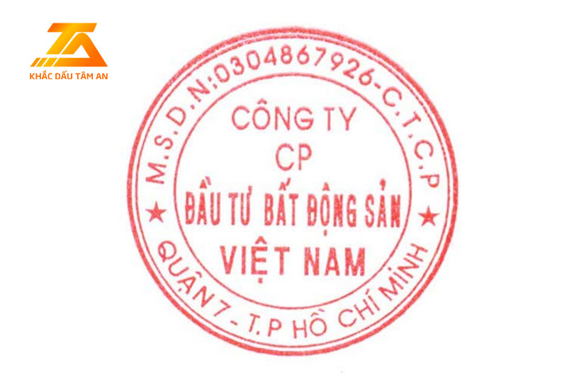 Dấu bất động sản bao gồm tên, chức vụ, logo, số điện thoại của công ty. Loại con dấu này thể hiện sự chuyên nghiệp của các công ty chuyên về kinh doanh bất động sản. Thường thì con dấu này đa dạng font chữ, màu sắc để khách hàng lựa chọn phù hợp với công việc, sở thích cá nhân.